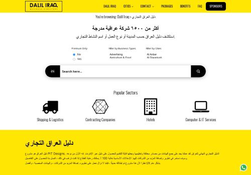 وصف الموقع: دليل العراق هو مشروع PIT Designs. الدليل التجاري النهائي للعراق. لقد عملنا بجد على جمع البيانات من مصادر مختلفة وتنظيمها وجعلها قابلة للتقديم للحصول على دليل عبر الإنترنت. إنه الأول من نوعه. وسوف نستمر في تطوير وإضافة المزيد من الشركات إليها. الإدخالات الأساسية خالية 100 ٪. يمكنك رعاية القطاع إذا كنت ترغب في ذلك ، اتصل بنا للحصول على التفاصيل. نظرًا لأن هذا مشروع تم إطلاقه حديثًا ، فإننا لا نزال نعمل على تطويره. إضافة المزيد من الشركات ، والبيانات المخصبة ، وأفضل UX بشكل عام.