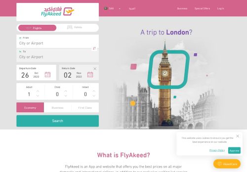 وصف الموقع: يقدم موقع حجوزات طيران فلاي أكيد المسافر أعمال لوحة تحكم للشركات للتحكم بسياسات السفر ، متابعة مصاريف السفر ، واكتشاف فرص التوفير من خلال تقارير فورية مفصلة وإسناد تلقائي لمراكز التكلفة لكل مصروف في السفر. كما يوفر فرصة توفير استثنائية ومباشرة للشركات الصغيرة والمتوسطة للحصول على فواتير ضريبية تساعد في إعداد تقارير ضريبة القيمة المضافة. https://business.flyakeed.com