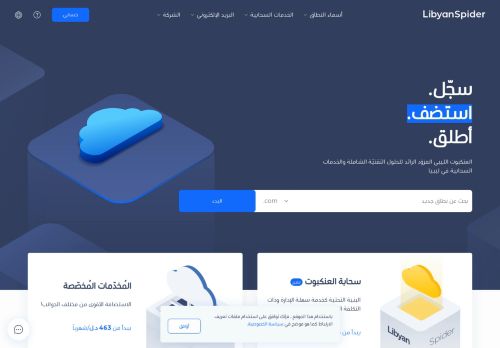 وصف الموقع: تقدم الشركة لزبائنها منذ العام 2002 عدة خدمات تقنية حديثة كتسجيل أسماء النطاق والاستضافة، وغيرها من الحلول السحابيّة للأفراد والمؤسسات التجارية الصغيرة منها والكبيرة. المساهمة في دعم مسار التحوّل الرقمي المحلّي عبر تبنّي وتقديم الخدمات والحلول السحابيّة الحديثة كليًا. شركة العنكبوت الليبي تضمن لزبائنها من الأفراد ومختلف المؤسسات العامّة والخاصّة في شتى المجالات خدمات مرضية وحلول رقميّة مصمّمة لتغطية كافة الاحتياجات المهنيّة المتزايدة.