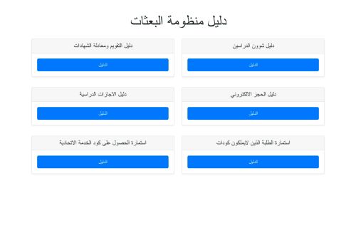 وصف الموقع: دليل منظومة البعثات. دليل التقويم ومعادلة الشهادات. الدليل. دليل شوون الدراسين. الدليل. دليل الاجازات الدراسية. الدليل. دليل الحجز الالكتروني