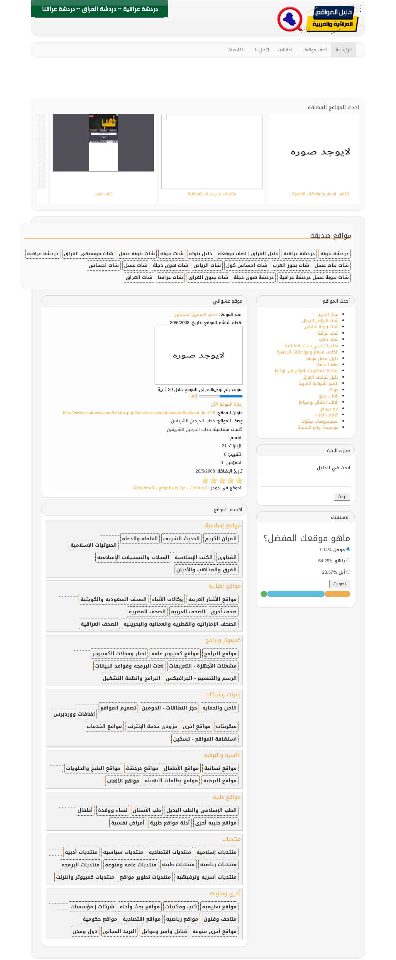 وصف الموقع: اشهر واضف موقعك ,لمحركات البحث , دليل المواقع ,دليل العراق ,دليل الدردشات ,مواقع إخبــارية , منتديات عربيــة, بحـــث وأدلـــــة , تجارة الكترونية, إنترنت وشبكات , كتب ومكتبــات , مـــال وأعمــــال , مواقع طــبــيــة