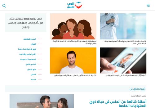 وصف الموقع: مشروع “الحب ثقافة” مشروع متعدد الأنشطة يناقش موضوعات الصحة الجنسية والإنجابية لدى الشباب، يضم منصة رقمية متعددة الوسائط توفر للمتابعين معلومات صحية وعلمية في موضوعات الحب والزواج والجنس. ويجري العديد من اللقاءات والتدريبات عن قضايا الصحة الجنسية والإنجابية. تم إطلاق مشروع الحب ثقافة في مارس 2014 في مصر. يقدم المشروع خدماته إلكترونياً عبر منصاتنا المختلفة، وعلى الأرض من خلال تدريبات وشراكات وأنشطة متعددة.