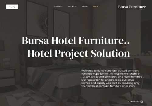 وصف الموقع: مصنع بورصة للأثاث الفندقي بتركيا ، لدينا احد اكبر مصانع الأثاث الفندقي في تركيا ، نفذنا اكثر من 170 مشروع أثاث فندقي ناجح علي مستوي العالم ، نجحنا في تنفيذ 68 مشروع تأثيث فندقي في السعودية